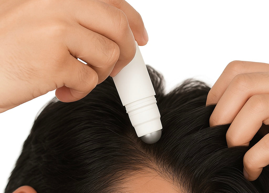 Appliquez le sérum roll-on directement sur le cuir chevelu, raie par raie.